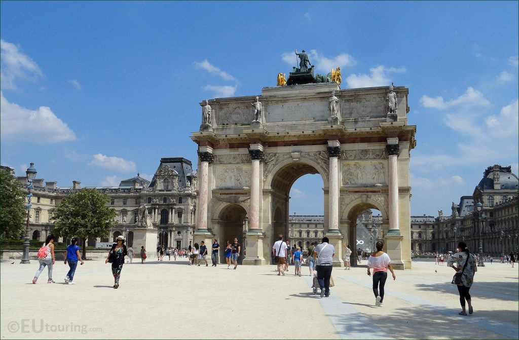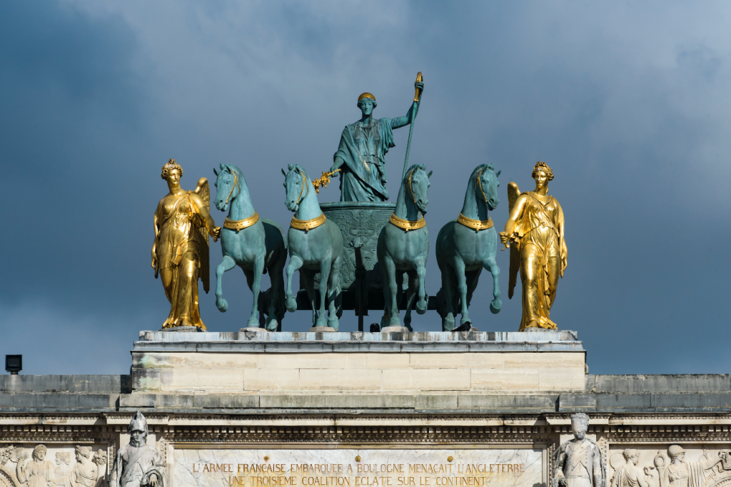 Construit sous l’Empire entre le palais du Louvre et celui des Tuileries, l’Arc de triomphe du Carrousel s’inspire de l’Arc de Constantin à Rome. Le quadrige à son sommet est une copie des chevaux de Saint-Marc, pris par les Vénitiens à Constantinople et placés sur la façade de la basilique Saint-Marc. Il est flanqué de deux renommées, la Victoire à droite et la Paix à gauche. Elles sont en plomb doré et réalisées par le sculpteur François-Frédéric Lemot. On les remarque de loin à cause de leur dorure.